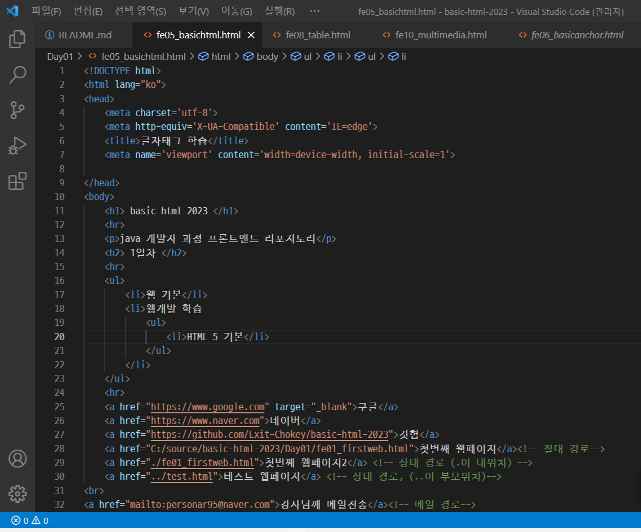대략적인 웹사이트의 구성요소는 설명을 마치고 이제는 강의에서 배운 순서대로 내용을 정리해야겠다. 태그따로 속성 따로 이렇게 하고 싶지만 그 양이 방대하기도 하고 이번 주제에서는 배운대로 정리하는게 더 깔끔할거 같다.