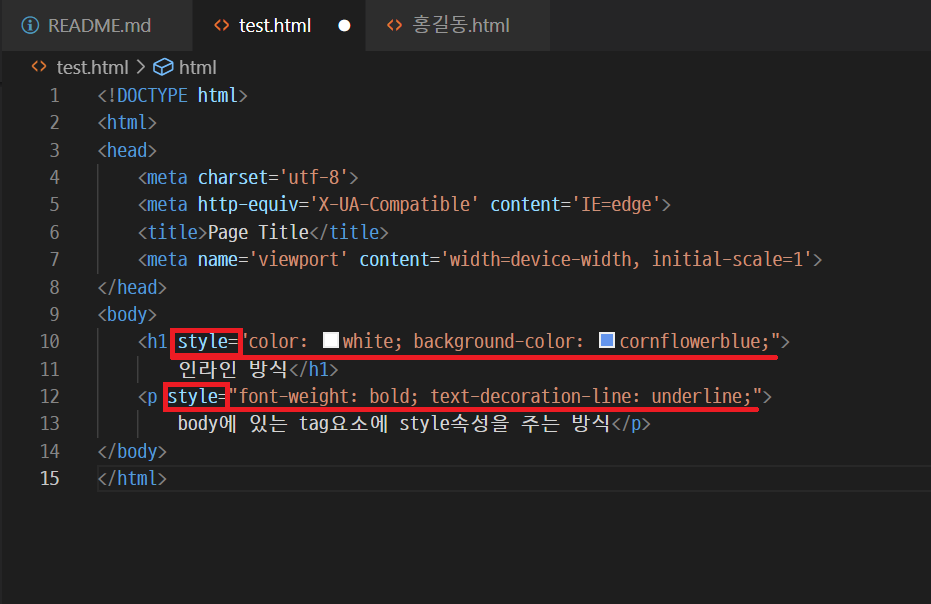 ① 인라인 방식 : <body> 안에있는 <html> 태그에 style 속성을 주어 바꾸는 방법.